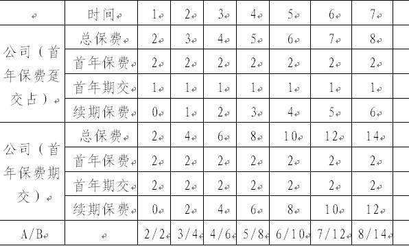 A和B公司是不同的公司。A公司首年保费中趸缴保费占50%,期缴保费占50%。B公司首年保费100%都是期缴保费。假设这两个公司每年首年保费都是2元并且期缴保费100%续保。我们先看A公司,第一年公司总保费是2元,到第二年虽然收了2元的首年保费,有一年续缴保费,总保费是3元。第三年因为已经有前两年2元续期,所以总保费4元,以此类推。再看B公司,第一年保费是2元,第二年还是2元,但是有上一年2元续期,所以总保费是4元。第三年还是2元新单保费,加上4元续期保费,总保费6元。由此可以看出,到第三年B公司已经有6元总保费,A公司只有4元,越往后两个公司的差距越大。