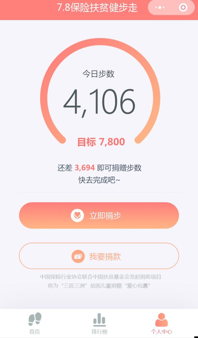 (活动页面示意图) 活动时间 2018年6月25日06:00 - 7月8日18:00。 活动平台 微信小程序“7.8保险扶贫健步走” 活动内容 参与者在活动期间登陆微信小程序“7.8保险扶贫健步走”,当天累计达到7800步并选择“四川”就可生成四川保险扶贫项目,由保险公司认领实施。活动期间每天可重复捐步,并可重新选择捐赠地区。7月8日当天的步数双倍累计。捐献完成1次、5次或连续10天捐赠即可获得相对应的“保险扶贫公益捐赠达人”虚拟勋章。
