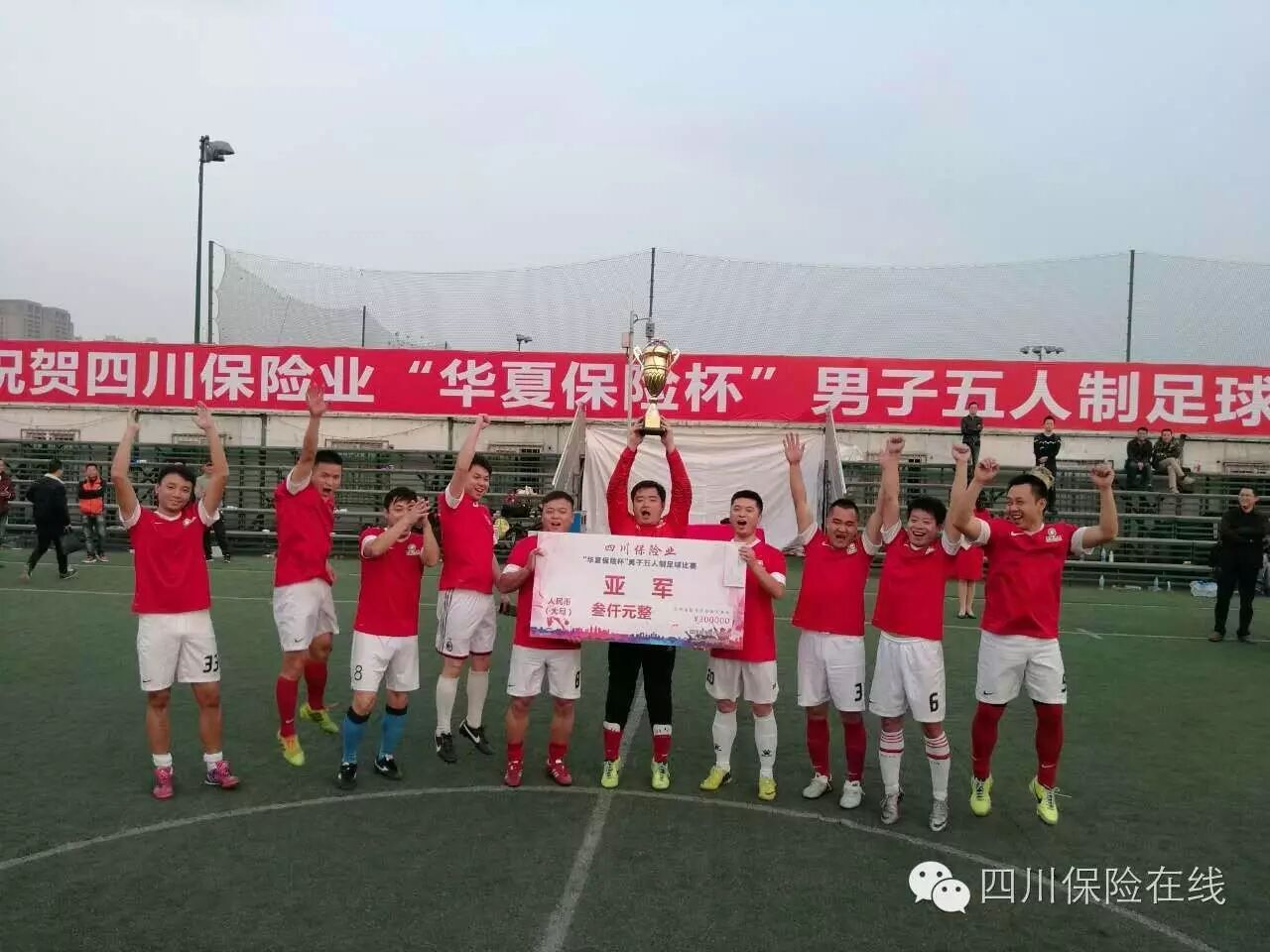 11月30日下午,天公作美,万里晴空,在成都市美洲时尚体育公园中心球场,2016年四川保险业“华夏保险杯”男子五人制足球赛决赛暨闭幕式圆满结束。经过激烈的比拼,中国人保财险四川省分公司代表队以2:1的比分战胜中国人寿四川省分公司队,太平洋人寿四川分公司代表队以4:1的比分战胜天安人寿四川分公司代表队。比赛最终结果为中国人保财险四川省分公司获冠军,中国人寿四川省分公司获亚军,太平洋人寿四川分公司获季军。