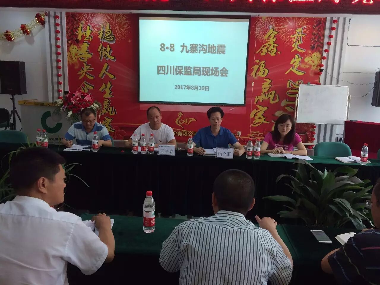 “8.8”九寨沟地震四川保监局现场会8月10日下午在中国人寿保险九寨沟县支公司召开。四川保监局副局长杨立旺、产险处处长张锐、寿险处处长蒋怡、省协会秘书长周虎、九寨沟县王华春副县长和中国人寿、中国人保、中华联合、中航安盟等在县城的各保险公司负责人参加了会议。会议对进一步加快理赔工作进行了部署。
