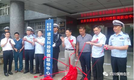 日前,四川自贡市高新区道路交通事故纠纷联调联动中心正式揭牌运行,标志着由自贡市保险行业协会、自贡市中级人民法院、市公安局、市司法局四方合力,探索多元化解纠纷机制社会创新模式落地的全市第一家试点机构。四川省保险行业协会保险合同争议人民调解委员会主任蔡剑、自贡市中院副院长张阳、自贡市公安交警支队支队长赵平、自贡市司法局副局长余小焱等领导参加揭牌仪式。